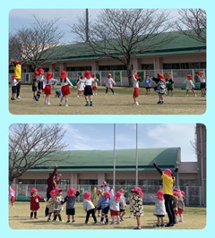 グラウンドで体を動かして、伸び伸びと体操をします。